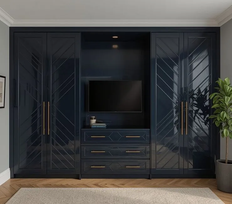 Эффектный встроенный шкаф глубокого синего цвета с глянцевыми фасадами и изысканным геометрическим рисунком. Центральная зона оснащена нишей для телевизора и тремя вместительными выдвижными ящиками с золотистыми ручками. Боковые секции за распашными дверями предоставляют обширное пространство для хранения одежды, аксессуаров и других вещей. Встроенная точечная подсветка над ТВ-зоной добавляет интерьеру уют и стиль.