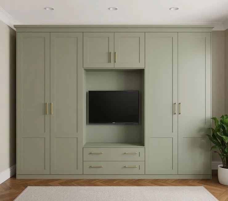 Стильный современный шкаф с фасадами в нежном оливковом цвете, идеально подходящий для спальни или гостиной. Центральная ниша рассчитана на установку телевизора и оснащена двумя вместительными выдвижными ящиками. Боковые секции с распашными дверями предоставляют достаточно места для хранения одежды и аксессуаров, а верхние антресоли позволяют разместить сезонные вещи. Элегантные золотистые ручки добавляют изысканности.
