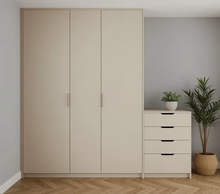 Внешнее оформление выдержано в нейтральной стилистике с акцентом на прямые линии и сбалансированные пропорции. Такое решение упрощает сочетание гардероба с другими предметами корпусной мебели и поддерживает визуальный порядок интерьера. Конструктив предусматривает удобный доступ ко всем зонам хранения без перегрузки пространства. Фурнитура рассчитана на многократные циклы открывания и закрывания, обеспечивает точную работу элементов и стабильное положение фасадов.