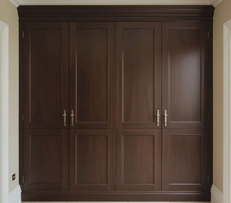 Элегантный встроенный шкаф из массива тёмного ореха с классическими филёнчатыми фасадами и изящными металлическими ручками. Гармонично сочетается с классическим и современным интерьером, добавляя ему солидности и утончённости.