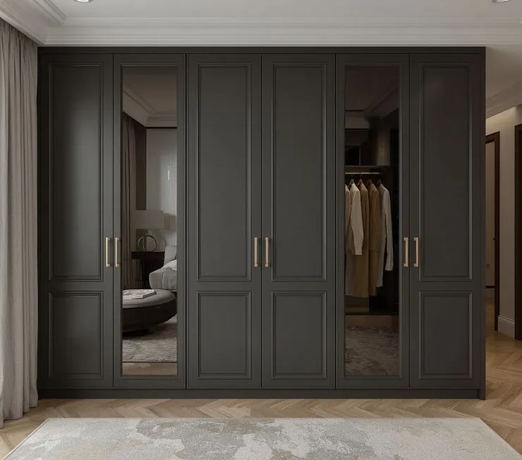 Современный встроенный шкаф в элегантном графитовом оттенке. Фасады выполнены с классическим фрезерованным рисунком и дополнены зеркальными вставками, что визуально расширяет пространство комнаты. Стильные золотистые ручки придают изделию утонченность и благородство. Идеальное решение для спальни или гардеробной в современном стиле.