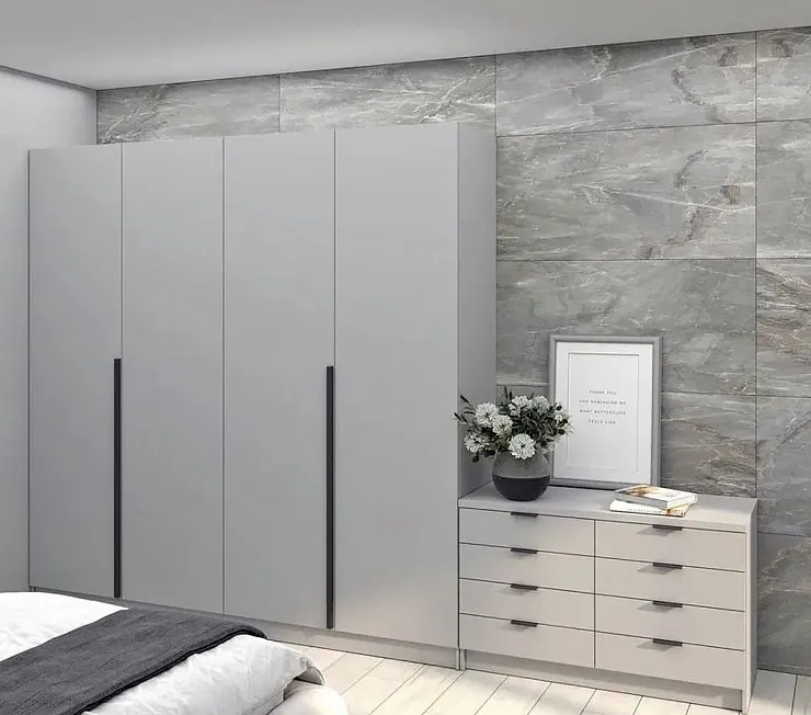 Современный гарнитур в нейтральном бежевом цвете. Тумба включает 8 выдвижных ящиков, шкаф состоит из 2 полноразмерных секций для хранения одежды, белья, обуви и аксессуаров. Благодаря небольшим размерам, систему хранения и тумбу можно разместить даже в компактной спальне. Фасады - МДФ в светло-серой эмали, корпус изготовлен из ламинированной ДСП. Штучное изготовление по индивидуальным размерам.