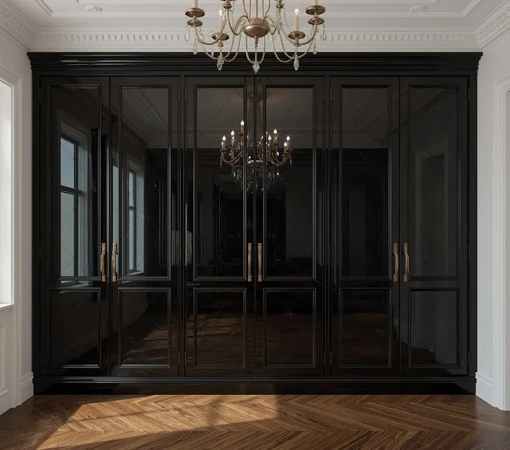 Элегантный встроенный шкаф в глянцевом чёрном исполнении с зеркальными фасадами, украшенными алмазной стёжкой. Роскошный дизайн подчёркивают массивные бронзовые ручки и классическая фрезеровка. Идеально подходит для интерьеров в стиле luxury, арт-деко или неоклассика. Такой шкаф станет не только местом для хранения, но и эффектным акцентом комнаты.