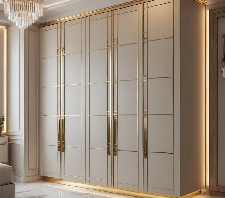 Роскошный встроенный шкаф в классическом стиле с матовыми фасадами и золотыми декоративными вставками. Вертикальные ручки и утончённая геометрия линий придают модели аристократичную элегантность. Подсветка по периметру подчёркивает премиальный характер и создаёт атмосферу уюта. Отличное решение для интерьеров в стиле неоклассика и арт-деко.