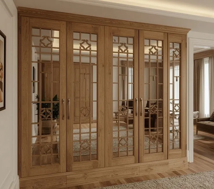 Элегантный встроенный шкаф из массива ясеня с шестью распашными дверями, украшенными зеркалами и декоративными деревянными решётками в классическом стиле. Зеркала визуально расширяют пространство, а резные элементы придают шкафу утончённый и дорогой вид.