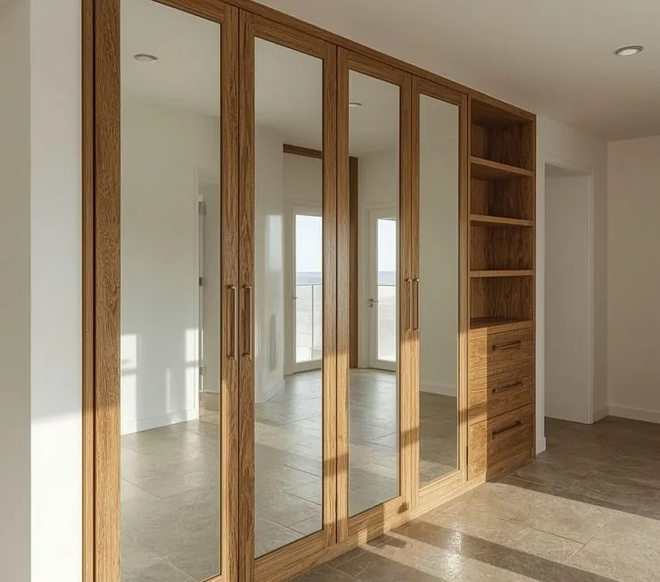 Стильный шкаф от стены до стены, выполненный из натурального дуба, с четырьмя зеркальными дверцами и открытой боковой секцией с полками и ящиками. Зеркала визуально расширяют пространство, а комбинированное хранение делает модель максимально функциональной.
