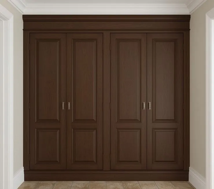 Вместительный встроенный шкаф из массива тёмного ореха с классическими филёнчатыми дверцами. Лаконичные квадратные ручки из полированного металла создают гармоничный баланс между строгой классикой и современным минимализмом.