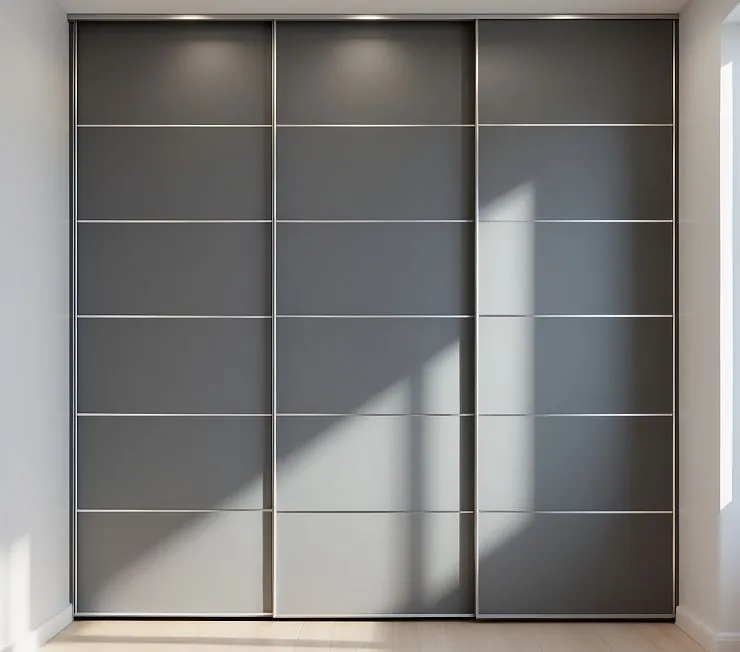 Современный встроенный шкаф-купе с тремя раздвижными фасадами в насыщенном графитовом цвете. Белые горизонтальные вставки придают конструкции лёгкость и динамику, подчеркивая стильный минимализм и строгость линий. Идеально впишется в современный интерьер спальни, гардеробной или прихожей.
