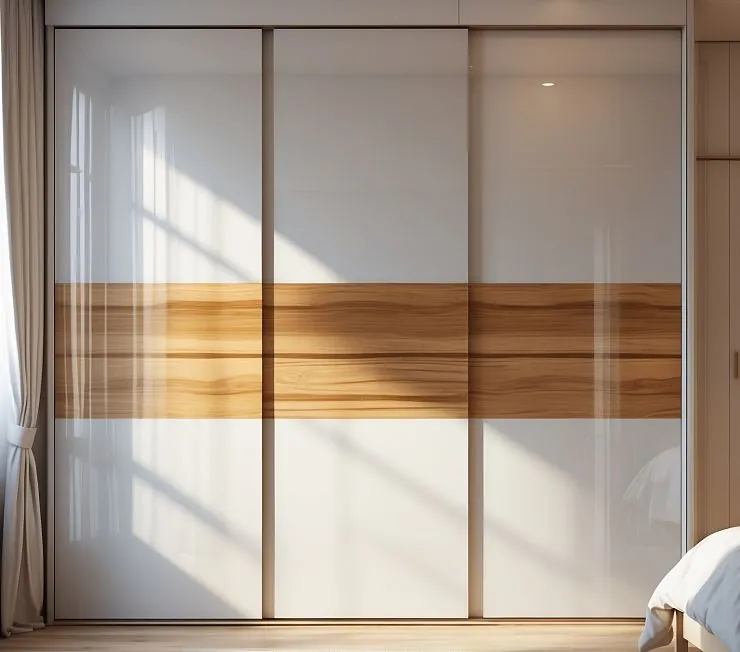 Современный шкаф-купе с тремя раздвижными дверями. Глянцевые белые фасады украшены горизонтальной вставкой из натурального шпона с яркой древесной текстурой, создавая гармонию минимализма и уюта. Идеально подойдёт для спальни или гардеробной, позволяя экономить пространство.