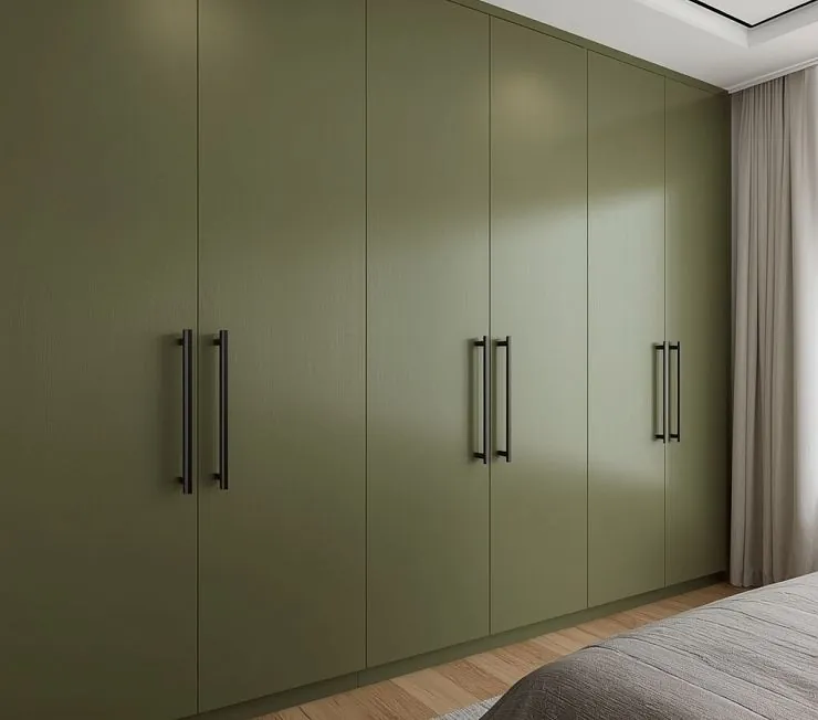 Встроенный шкаф с гладкими, полноразмерными дверцами в утончённом оливковом сатиновом оттенке. Оснащён длинными чёрными металлическими ручками, подчёркивающими минималистичный стиль. Идеально впишется в современный интерьер спальни, добавив в него спокойствия и элегантности.