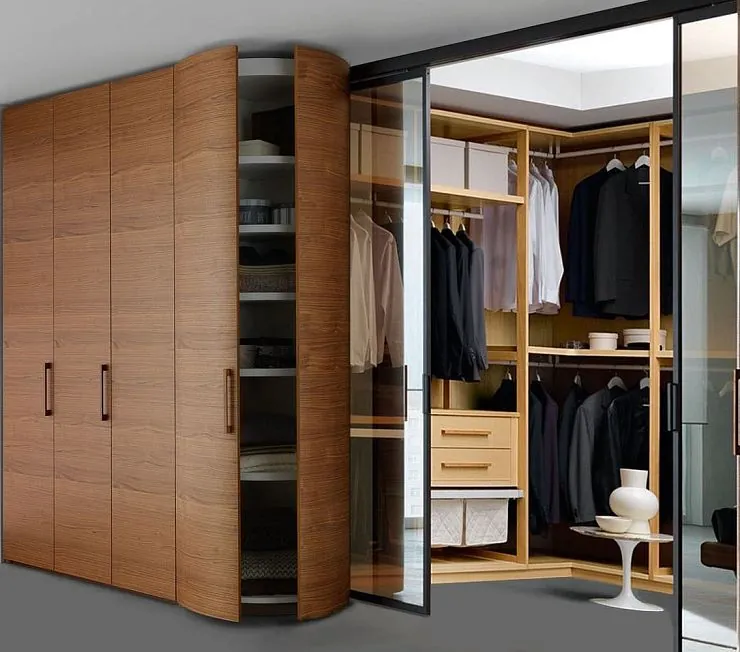 Вместительная и функциональная система хранения состоит из встроенного высокого шкафа и маленькой гардеробной комнаты, что позволяет максимально рационально использовать пространство. Фронтальная часть шкафа закрывает даже боковые радиусные полки, может быть выполнен из массива или МДФ в шпоне или плёнке. Гардеробная закрывается прозрачными тонированными раздвижными дверями.