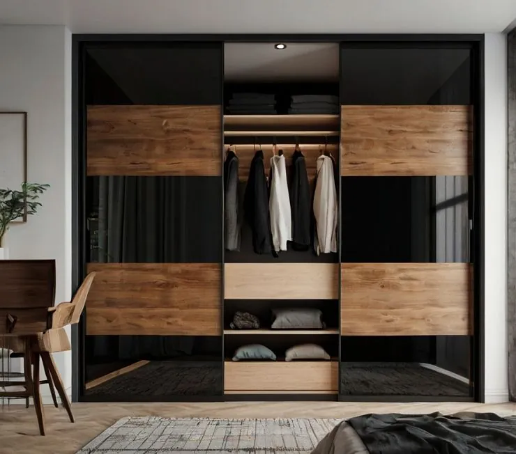Просторный трёхдверный шкаф-купе с фасадами, выполненными в контрасте черного стекла и тёплого древесного декора. Центральная секция открыта и демонстрирует продуманное внутреннее наполнение: две штанги для одежды, открытые полки и встроенная подсветка. Отличное решение для спальни или гардеробной. Встроенное освещение создаёт удобство и эффектный визуальный акцент.