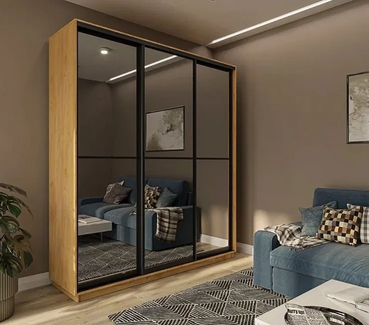 Текстура натуральной древесины и зеркальные фасады-купе в черной раме - сочетание для тех, кто обладает безупречным вкусом. Содержание не уступает форме: система хранения включает открытые полки, просторную секцию для одежды, антресольную нишу, выдвижные ящики, ниши для обуви. Корпус модели - из высококачественной ЛДСП, надежная фурнитура “Хеттих”. Для заказа понадобится предварительный выезд нашего специалиста: модель изготавливается штучно, на заказ.