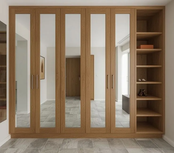 Стильный шкаф от стены до стены, выполненный из натурального дерева с фасадами, полностью облицованными зеркальными панелями. Открытые боковые полки обеспечивают удобное хранение обуви, аксессуаров и декора. Идеально подходит для прихожей или гардеробной, визуально увеличивая пространство и создавая ощущение лёгкости.