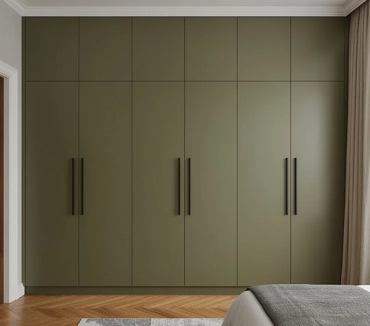 Встроенный шкаф с полновысотными дверцами, выполненными в изысканном оливковом оттенке с мягким сатиновым финишем. Лаконичные длинные чёрные ручки подчёркивают современный минималистичный стиль, а верхний ярус с дополнительными секциями позволяет максимально эффективно использовать пространство.