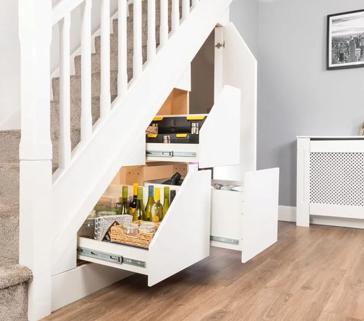 Небольшой распашной шкаф под лестницей с тремя ящиками S118