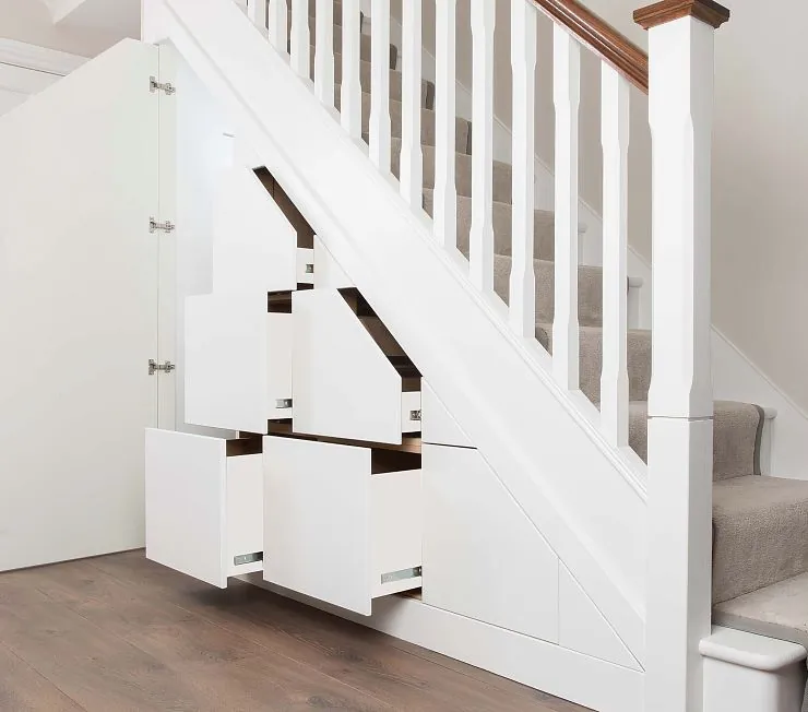Модель изготавливается по индивидуальным замерам и включает распашной шкафчик и пять глубоких ящиков. Практичный вариант для полезного использования пространства под лестницей. Фасады - ЛДСП в белой ПВХ-пленке, а фурнитура Hettich - гарантия надежности и удобного использования. Под заказ, нужен выезд нашего дизайнера-замерщика.