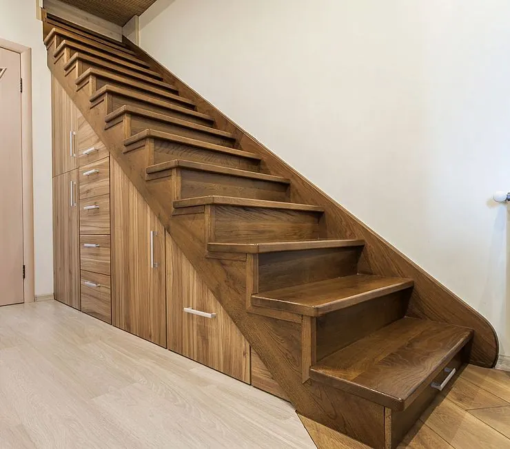 Ниша под лестницей превращается в престижный шкаф из массива. Вместительная модель с ящиками и отсеками с распашными дверями. Изготавливается под заказ, продается по цене производителя.