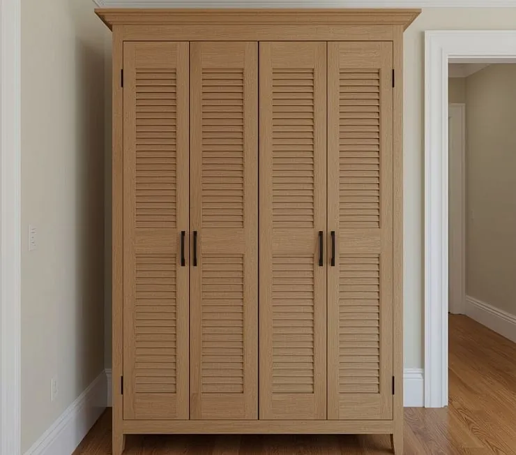 Традиционный четырёхстворчатый шкаф из массива дуба с лувровыми фасадами, обеспечивающими естественную вентиляцию. Оснащён современными чёрными ручками, что придаёт классическому дизайну актуальный вид.