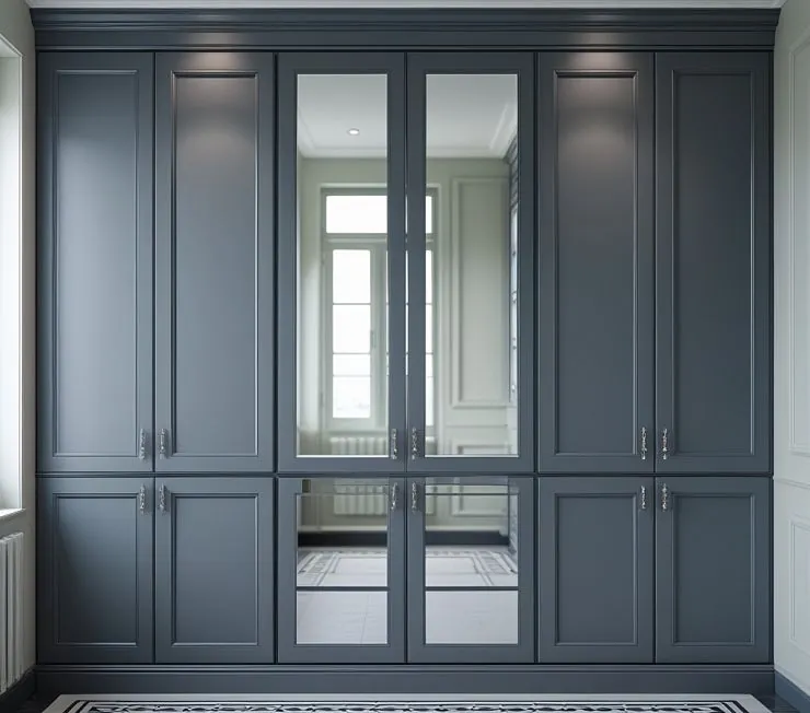 Элегантный встроенный шкаф в насыщенном графитовом цвете с классическими филенчатыми фасадами. Центральные двери украшены зеркальными вставками в полный рост, визуально расширяющими пространство и добавляющими практичности. Изящные металлические ручки с утончённым декором подчеркивают премиальный стиль мебели. Идеально подходит для прихожей, спальни или гардеробной.
