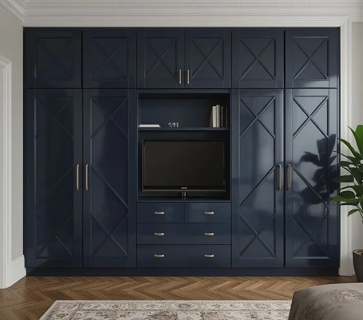 Элегантный встроенный шкаф глубокого синего цвета с глянцевыми фасадами и выразительным перекрестным декором. Центральная ниша оборудована местом для телевизора и открытой полкой для книг или декора. Ниже расположены три вместительных выдвижных ящика, обеспечивающих удобное хранение. Верхние антресоли позволяют использовать всю высоту помещения. Металлическая фурнитура подчёркивает современный и статусный характер изделия.