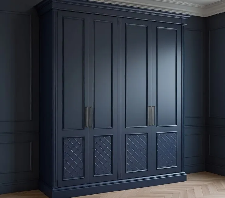 Эффектный встроенный шкаф в насыщенном матовом тёмно-синем цвете. Фасады украшены декоративными филёнками и вставками с геометрическим рельефным узором, что придаёт мебели аристократичный вид. Металлические ручки подчёркивают строгую элегантность. Отлично подходит для классических и современных интерьеров премиум-класса.
