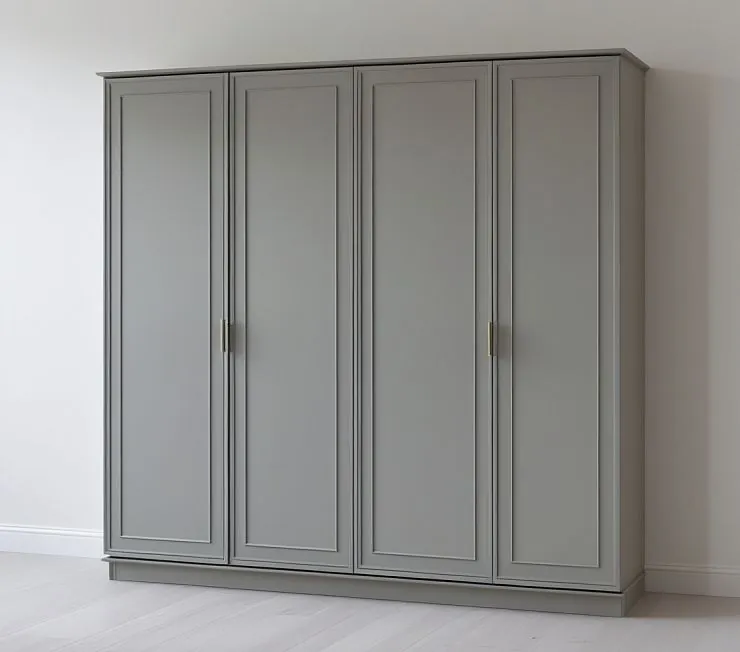 Стильный четырёхстворчатый шкаф в современном скандинавском стиле. Выполнен в нежно-сером матовом цвете с аккуратными фрезеровками по фасадам и компактными металлическими ручками. Минималистичный дизайн делает его универсальным решением для спальни или гостиной.
