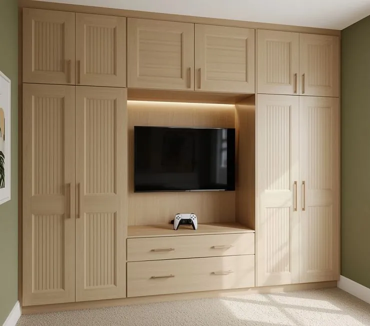 Светлый многофункциональный шкаф в скандинавском стиле, выполненный из ламинированных панелей с вертикальной фрезеровкой на фасадах. Центральная ниша для телевизора оснащена мягкой LED-подсветкой, создающей уютный акцент в интерьере. Под ТВ расположены два вместительных выдвижных ящика для хранения аксессуаров, техники и документов. Боковые секции с распашными дверцами обеспечивают обширное пространство для одежды и других вещей.