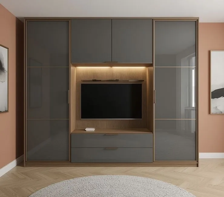 Современный шкаф в стильной комбинации серого глянца и тёплого дерева. Центральная часть оснащена нишей для телевизора с встроенной LED-подсветкой, создающей уютную атмосферу. Над ТВ расположены компактные шкафчики, а внизу — два вместительных выдвижных ящика для хранения аксессуаров и техники. Боковые секции выполнены с раздвижными дверцами, что экономит пространство и делает конструкцию удобной для небольших комнат.
