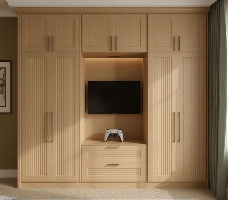 Свободностоящая симметричная система хранения с распашными дверцами и центральной нишей под телевизор. Фасады МДФ с вертикальной фрезеровкой, корпус — ЛДСП 18–22 мм, кромка ABS 2 мм. В центре — ниша с LED-подсветкой и тумбой на 2 выдвижных ящиках (на направляющих с доводчиками). Петли с доводчиком, металлические ручки. Шкаф даёт много закрытого хранения для одежды и белья, а ниша удобно размещает ТВ и игровые приставки/медиаприставки.
