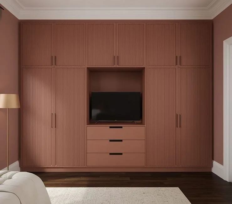 Современный встроенный шкаф тёплого терракотового оттенка с изящной вертикальной фрезеровкой по фасадам. Центральная ниша идеально подходит для размещения телевизора, а три вместительных выдвижных ящика обеспечивают удобное хранение вещей. Верхний ряд антресолей позволяет рационально использовать всю высоту помещения. Минималистичная фурнитура подчёркивает лаконичный и актуальный дизайн.