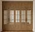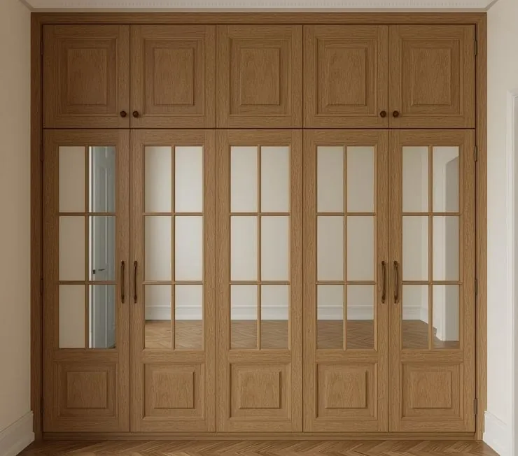 Встроенный шкаф с распашными фасадами, выполненными из шпонированного МДФ или массива. Верх — антресоли с глухими филёнками. Основные дверцы — с остеклением и классической раскладкой в виде переплётов. Нижняя часть фасадов — глухие филёнки. Ручки вертикальные, в классическом стиле. Потолок с карнизом. Решение подчёркивает архитектуру ниши.