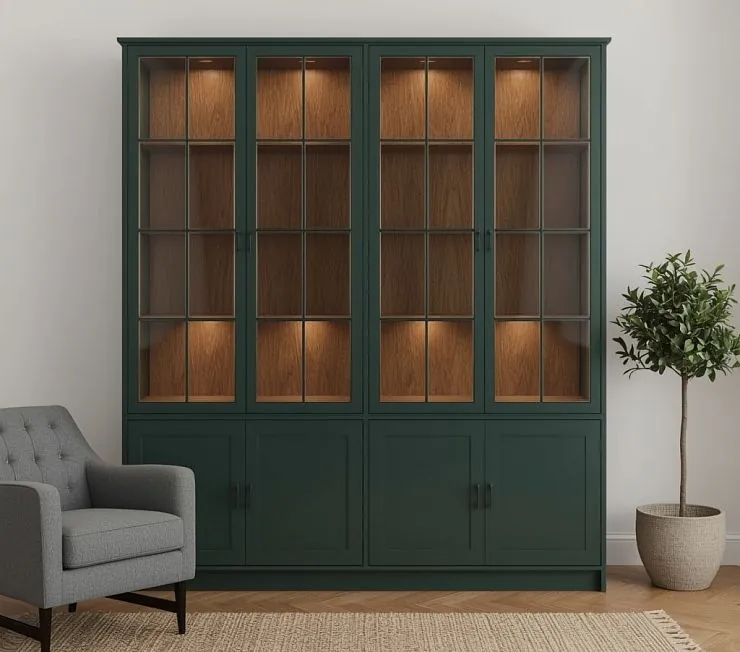 Современный книжный шкаф с корпусом в насыщенном цвете тёмного леса и тёплой деревянной отделкой внутри. Четыре распашные дверцы с остеклением в тонких переплётах подчёркивают геометрию и позволяют выгодно демонстрировать книги или коллекционные предметы. Нижние секции с глухими дверцами обеспечивают скрытое хранение. Встроенная подсветка добавляет уюта и подчёркивает фактуру материалов.