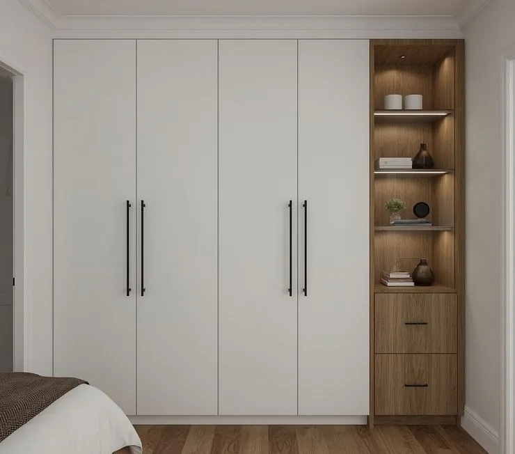 Полновысотный встроенный шкаф с гладкими матовыми белыми фасадами и контрастными черными ручками. Правая секция выполнена из теплого дубового шпона с открытыми полками и подсветкой, а также двумя выдвижными ящиками для хранения мелочей. Идеальное сочетание минимализма и уюта для современной спальни.