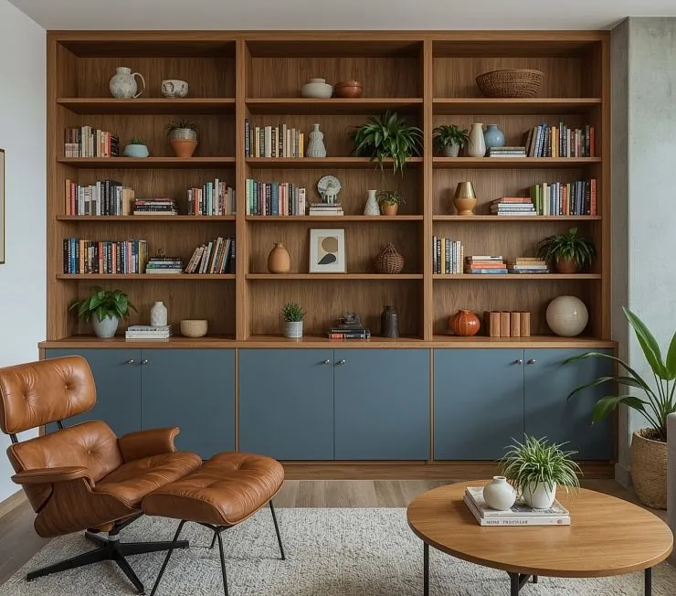 Большой встроенный книжный шкаф с корпусом из шпонированного МДФ (каталог Woodstock) и нижними секциями с глухими фасадами в синей эмали (цвет по RAL). Внутренние открытые полки предназначены для книг, декора и растений. Нижние отделения закрываются распашными дверцами с фурнитурой Blum. Изготавливается на заказ по индивидуальным размерам и конфигурации.