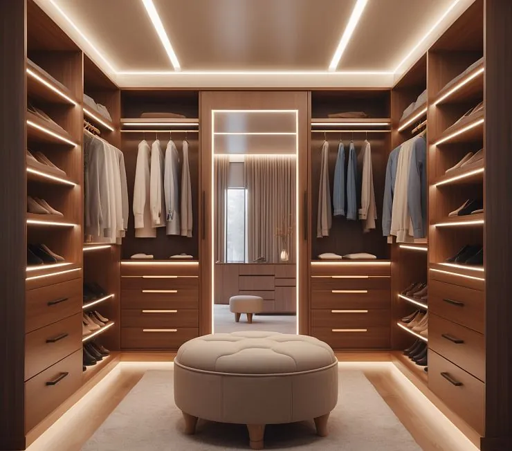 Роскошная симметричная гардеробная выполнена из натурального шпона в тёплом ореховом оттенке с равномерно распределёнными отделениями для одежды и обуви. Центральным элементом является полноразмерное зеркало с встроенной LED-подсветкой, визуально увеличивающее пространство. Встроенные ящики с мягким доводчиком и отделения с подсветкой создают удобную и эстетичную организацию хранения. Акцент делает мягкий пуф округлой формы в центре композиции. Гардеробная подойдёт как для мужского, так и женского интерьера в стиле современная классика или нео-мидсенчури.