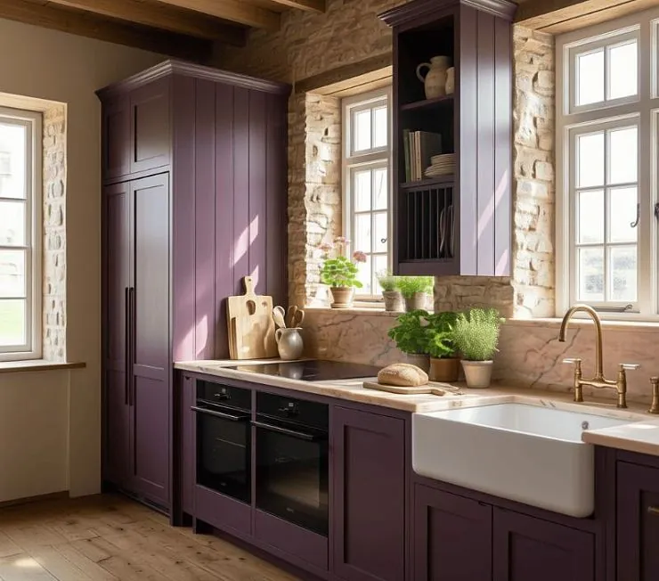 Изящная кухня в стиле английского кантри — это сочетание индивидуальности, уюта и традиционной элегантности. Фасады с классическими филёнками, выполненные из матового окрашенного МДФ в насыщенном сливовом оттенке (RAL 4007), создают атмосферу уюта и благородства, подчёркивая уникальность пространства. Высокие шкафы до потолка обеспечивают максимум хранения, а открытые секции придают композиции лёгкость и позволяют разместить любимую посуду и декор.