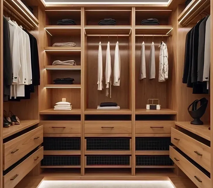 Гардеробная выполнена в отделке под натуральное дерево с акцентом на открытость и лёгкость. В конструкции предусмотрены штанги для одежды, полки, выдвижные ящики и сетчатые корзины для аксессуаров. Встроенная подсветка подчёркивает структуру материала и упрощает навигацию. Отлично подходит для оформления интерьеров в современном и скандинавском стиле. Изготавливается по индивидуальному проекту.