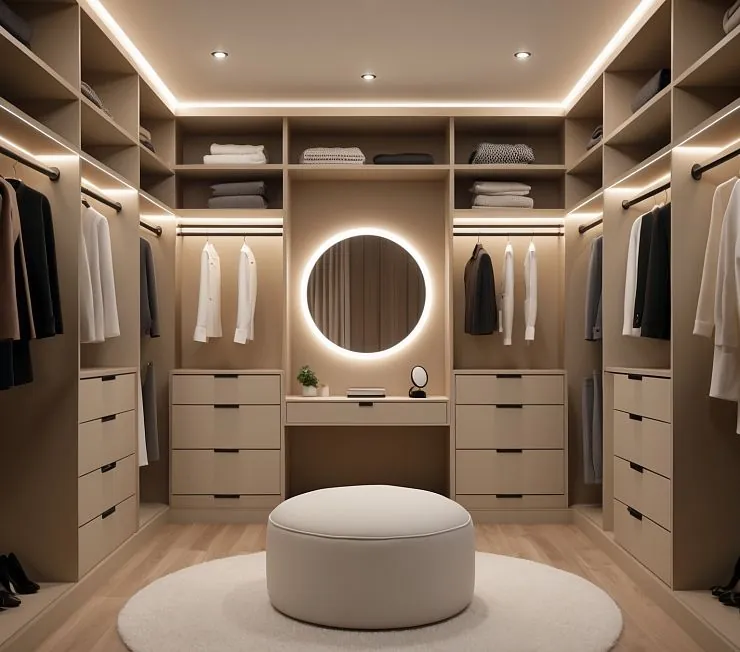 Стильная гардеробная в минималистичном стиле с тёплыми бежевыми оттенками и встроенной подсветкой. Центр помещения занимает удобный туалетный столик с зеркалом в светлом кольце, дополненный выдвижными ящиками. Шкафы и полки организуют хранение одежды и аксессуаров, при этом стиль и практичность соединяются в одном. Мебель изготавливается на заказ, подходя под любые размеры.