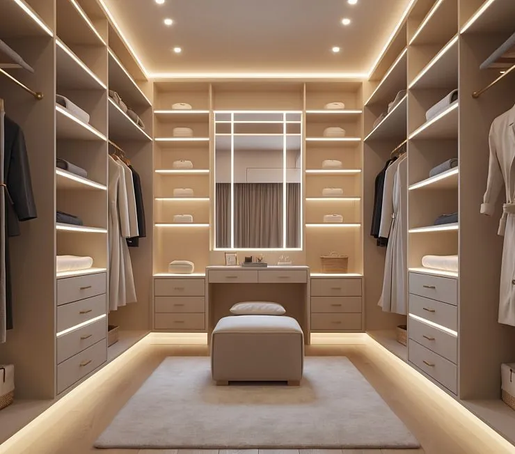 Элегантная гардеробная с идеально сбалансированным дизайном: теплые бежевые оттенки, мягкая подсветка и акцент на функциональность. Центральное место занимает туалетный столик с зеркалом и подсветкой, обрамлённый симметричными системами хранения. Открытые полки и выдвижные ящики обеспечивают порядок и удобство, а атмосферный свет подчеркивает эстетику и уют пространства.