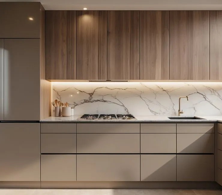 Элегантная линейная кухня с матовыми фасадами в бежево-серых тонах и верхними шкафами с отделкой под натуральное дерево. Белый мраморный фартук с серыми прожилками создаёт лёгкость и утончённость интерьера. Встроенная подсветка подчёркивает текстуру мрамора и делает рабочую зону максимально удобной. Гармоничное сочетание цветов и лаконичный дизайн идеально подойдут для современных квартир и частных домов.