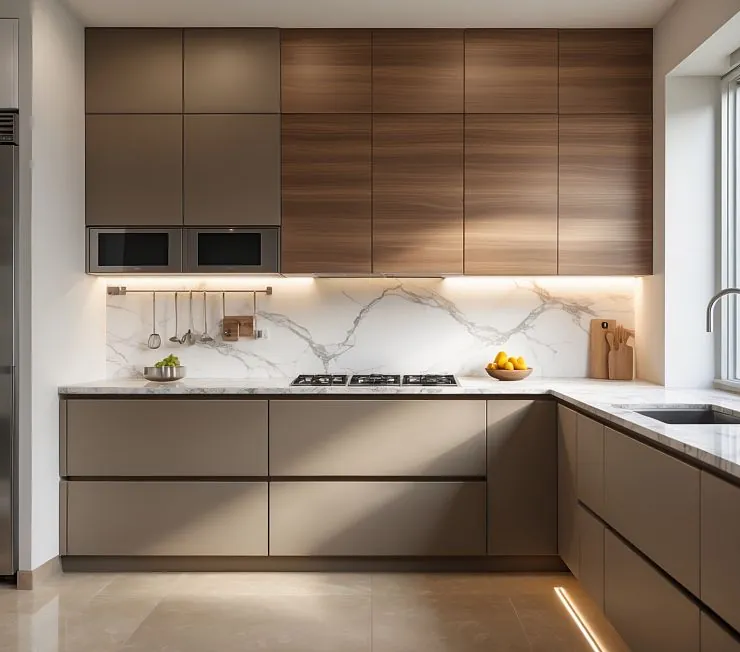 Современная П-образная кухня с матовыми фасадами в бежево-серой гамме и верхними шкафами с отделкой под натуральное дерево. Белый мраморный фартук с серыми прожилками гармонирует со столешницей, создавая ощущение лёгкости и простора. Встроенные духовые шкафы и эргономичная система хранения обеспечивают максимальный комфорт. Подсветка рабочей зоны делает интерьер стильным и функциональным.