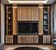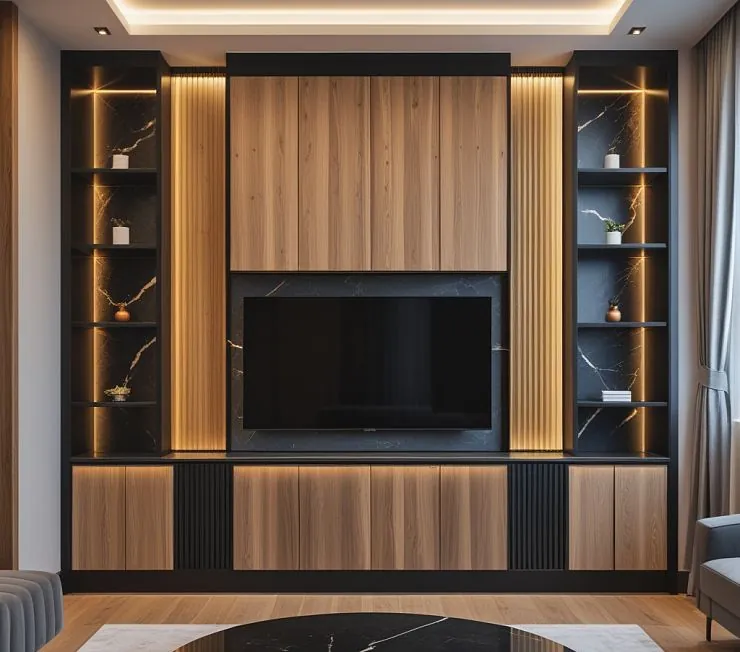 Эффектная стенка в современном стиле с отделкой под натуральный дуб, черным мрамором с белыми прожилками и рифлеными декоративными вставками. Центр композиции — ТВ-зона с отделкой из черного керамогранита и подсветкой по периметру. Слева и справа — открытые витрины с LED-подсветкой и черными матовыми полками. Нижняя секция состоит из выдвижных шкафов и фасадов push-to-open, скрывающих кабель-менеджмент. Идеальное решение для интерьеров в стиле модерн, минимализм и нео-лофт.