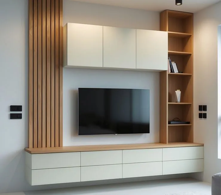 Элегантная и функциональная мебель для гостиной в стиле минимализм. Композиция включает подвесную ТВ-тумбу с шестью выдвижными ящиками, верхние навесные шкафы и встроенный открытый стеллаж. Натуральная отделка под дерево в сочетании с матовыми светлыми фасадами создаёт тёплую и уютную атмосферу. Вертикальные деревянные рейки слева добавляют текстурности и служат стильным акцентом.
