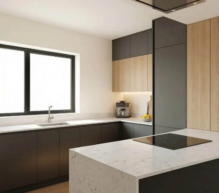 Низ и колонна — матовый графит (RAL 7016), верх — комбинация графита и светлого дуба. Столешница/полуостров — белый камень под Calacatta с прожилками, полуостров с водопадом и варочной панелью.