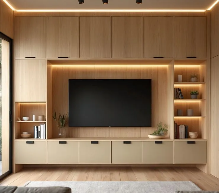 Функциональная и стильная стенка, выполненная из натурального шпона светлого дуба в сочетании с матовыми фасадами теплого бежевого оттенка. Центральная зона выделена под телевизор, обрамлённый панелями с LED-подсветкой. Открытые боковые ниши с регулируемыми полками подойдут для книг и декора. Верхние антресоли позволяют использовать максимум вертикального пространства без загромождения интерьера.