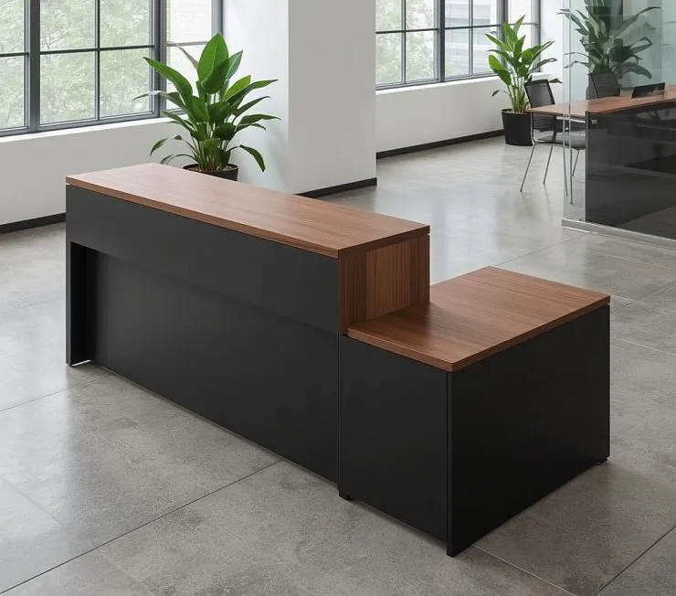 Минималистичная стойка ресепшн с матовым черным основанием и столешницей из шпона ореха. Стильная L-образная конструкция разделена на две функциональные зоны — высокую фронтальную панель для приема гостей и низкую рабочую зону для администратора. Идеально вписывается в современные офисные интерьеры, коворкинги и бизнес-центры.