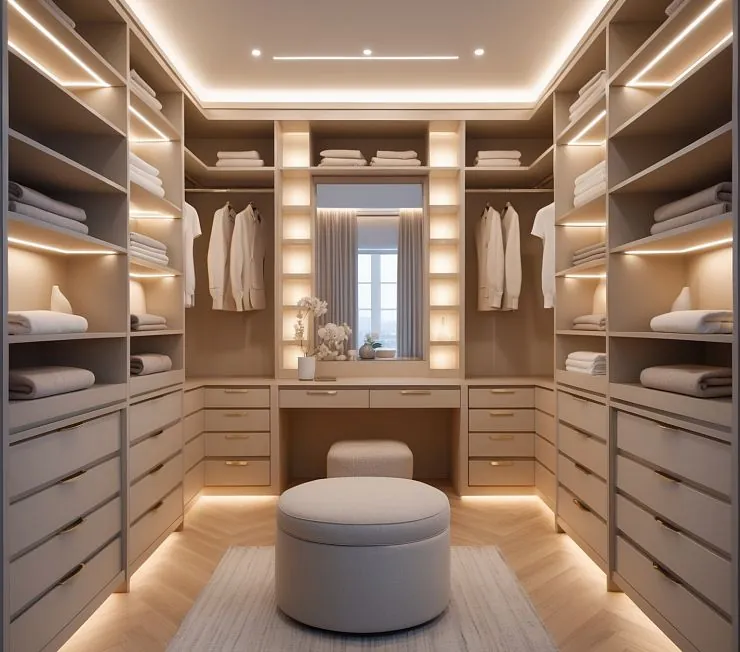 Элегантная гардеробная в мягких бежевых тонах с продуманной системой хранения по периметру и встроенным туалетным столиком у окна. Множество выдвижных ящиков и полок, подвесные зоны и ниша с зеркалом создают комфортное и функциональное пространство. Теплая светодиодная подсветка по периметру мебели и под полками добавляет уюта и акцентирует геометрию интерьера.