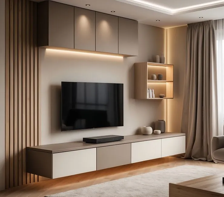 Эта стильная ТВ-зона выполнена в актуальных бежево-коричневых тонах с матовыми фасадами и теплой акцентной подсветкой. Нижняя подвесная тумба с комбинированной отделкой предоставляет достаточно места для хранения техники и аксессуаров. Верхние шкафы обеспечивают дополнительную вместимость, а открытая полка в деревянной отделке добавляет визуальной легкости и уюта. Рейка из массива на стене завершает композицию, придавая ей архитектурную выразительность.