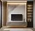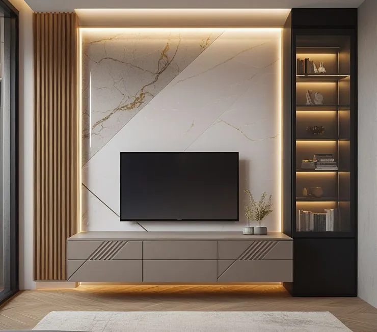 Роскошная ТВ-зона с акцентной декоративной панелью под мрамор с золотыми прожилками, эффектно подсвеченная по периметру встроенной LED-подсветкой. Подвесная тумба в цвете графит с геометрическими фасадными вставками придаёт интерьеру строгость и стиль. Стеллаж с подсветкой за стеклом добавляет витринный эффект и завершённость композиции.